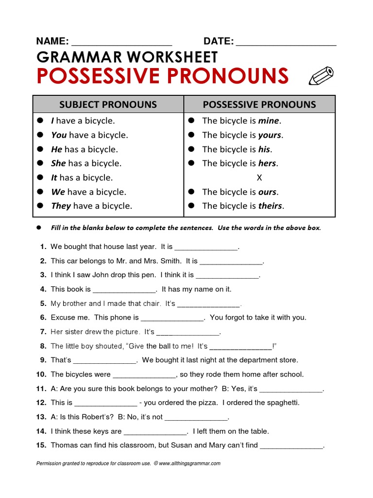 Pronouns Worksheets Possessive Pronouns Worksheets